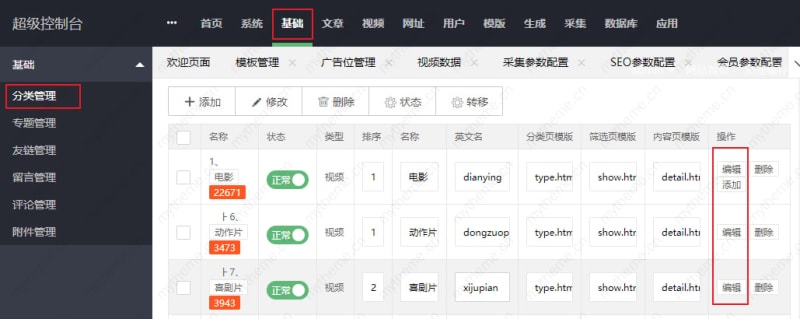 当前位置:无忧源码网 苹果Cms教程 苹果cms修改分类标题、关键字、描述 修改苹果cms分类页标题、关键字、描述seo优化直接在苹果cms系统后台搞定,具体步骤也很简单。1,来到系统后>>基础>>分类管理>>编辑2,点击编辑后你就可以清楚的看到需要修改的seo参数。 收藏