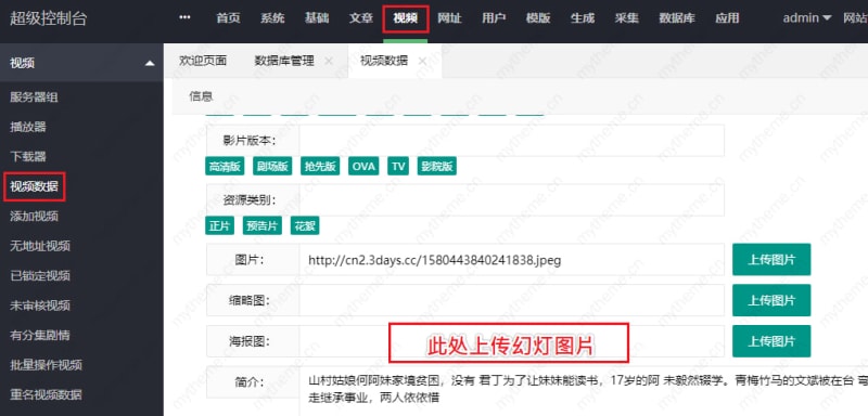 当前位置:无忧源码网 苹果Cms教程 教你设置苹果CMS首页幻灯轮播图片 看这个教程前请确保你的模板支持幻灯片,如果没有欢迎选购本站带幻灯的优质模板。1,首先在-后台》视频》视频数据中找一部需要推荐显示的影片,然后点击右边的编辑就可以看到和下图一样的界面了2.设置推荐1-9自己测试 模板写法不一只能自己测试 一般为5或是93,然后上传海报 收藏